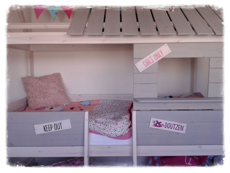 Voor dit kinderbed kreeg ik een blanco bordje waarop ik de naam van het meisje gezet heb.